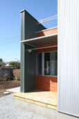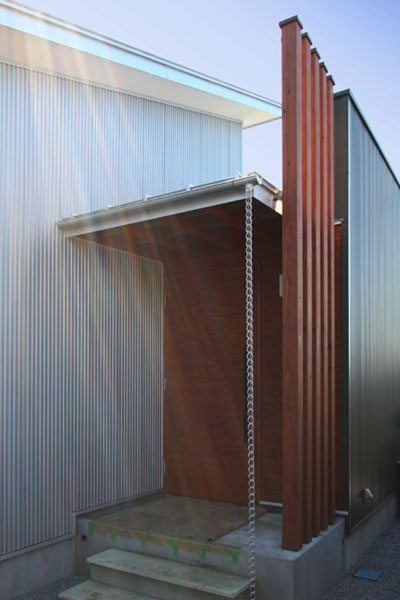 Pic04 玄関部分 独立した縦方向の木材、独立した水平ひさしが強調されるディテール