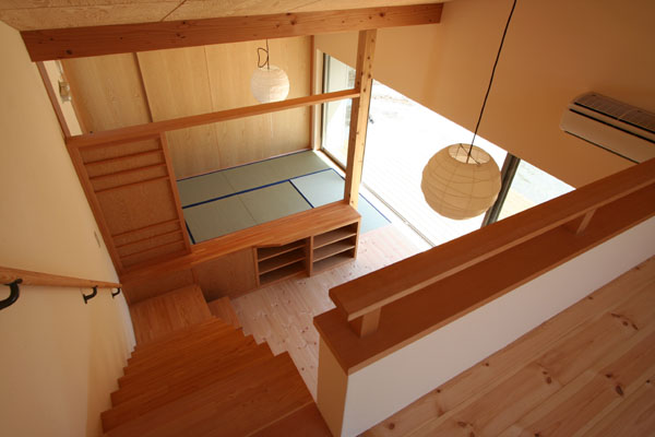 Pic07 畳の間よりリビング・2階方向を望む 壁は珪藻土。天井はラーチ合板。梁見出仕上。