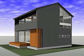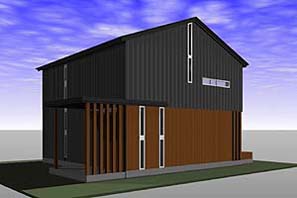 高根沢町の郊外、親世帯隣にたつローコスト住宅。外壁は墨色のガルバリウム鋼板と杉板竪貼。