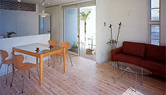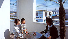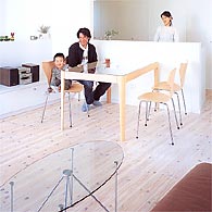 | 中学の同級生同士のカップルというMさんご夫妻は、現在ともに29歳。夫の実家の敷地内に家を建てることがかねてから決まっていたという。「先のことが読みにくいこの時代。どうせ建てるのなら無理をしても早く建てるほうがいい」と、結婚して間もない頃から家づくりの準備を開始した。住宅雑誌で住みたい家のイメージを求め、インターネットなども使って建築家を探した結果、宇都宮市を拠点とする建築家の星裕之氏にたどり着いた。「星さんは私たちの望むものをじっくりと引き出してくれようとするのがよかった」。2人がずっと温めていた夢の家は、白い塗り壁の外観を持ち、床は素足に心地よい無垢材で2階に広いバルコニーがある家。実現したバルコニーにはヒノキが貼られ、テーブルと椅子を置いてもなおゆとりがある余裕のスペース。空に向かって視界が大きく開けるロケーションが気持ちいい。ナチュラルな心地よさを追求した空間と、『無印良品のものが好き』という夫妻のインテリアセンスがマッチした、20代夫婦の等身大の家が完成した。 |