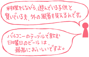 | ●周囲の視線を気にしなくてもいい、開けた場所ならではの、解放的なつくりが魅力のバルコニー。リビングから見えるバルコニーの佇まいが空間を広く見せ、ゆとりを感じさせる効果は大きい。 | |
