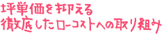 | コスト削減のための工夫と苦心が様ざまに散りばめられている。例えば、屋根には工場などで使われるルーフデッキを用いて、通常1週間は掛かる上棟と屋根工事を1日半で終わるようにし、大工の人件費と構造材料費を大幅に削減。それによる雨音や熱の問題は、屋根裏にウレタンを吹き付けることでクリア。また、外壁工事のコストを下げるため凹凸のない四角形の外観に。収納等は家具工事とせず、ポリランバーコア合板を使用して大工工事に。 | | | | |