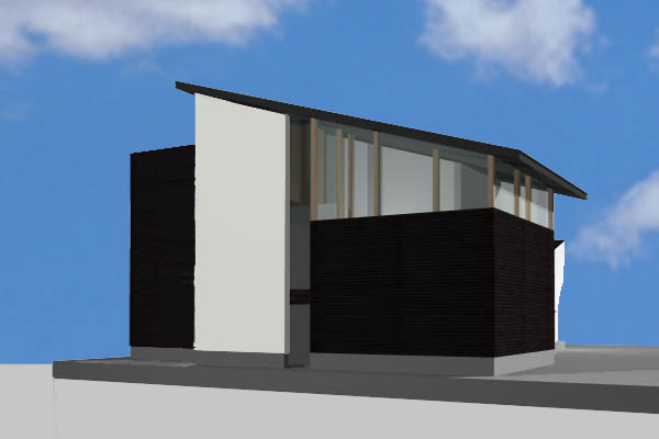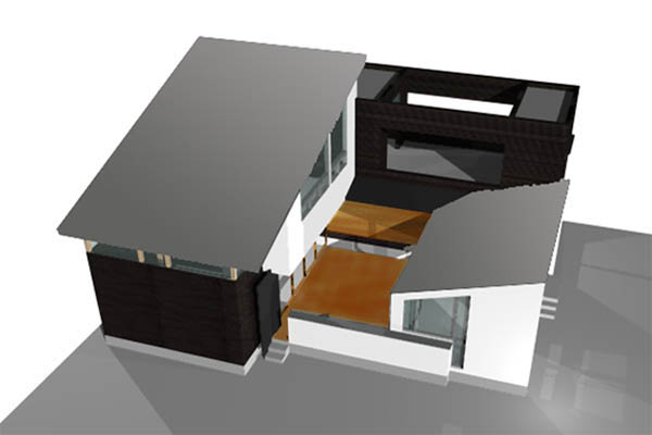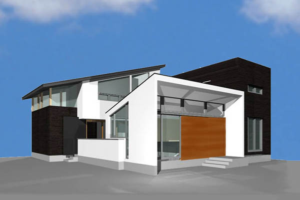建物は3つのボリュームと3つの素材から構成されます。