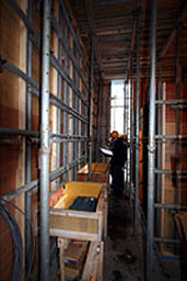 上部躯体内壁が立ちあがり壁配筋施工中です。RC打放なので電器配線等の確認を丁寧に行っています。