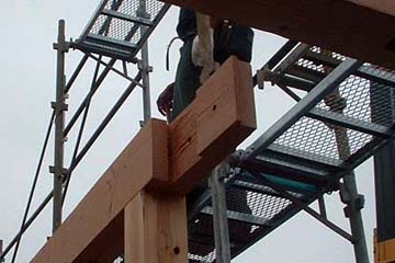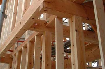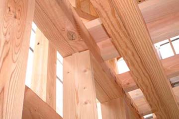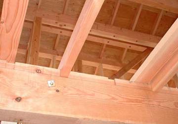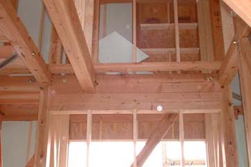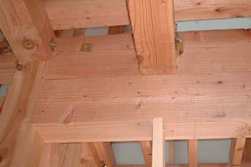 普通は二階の根太は梁の上に載せて、左右からハスにクギうちをするのが普通。ダメな大工は上部か直接ぶつ(脳天ブチ) 今回は二階の梁と根太を少し欠きこんで、組んでいく形になっている。渡りアゴ掛けという仕様だ。これを行いとほんとに建物が動かなくなる。特に構造用合板を貼ると斜めの火打ち梁は必要なく、さらに構造的に水平方向に対して安定している「剛床」と呼ばれるレベルに達すると住宅金融公庫からお墨付きがでている。ちなみに構造用合板を貼らず火打ちを入れただけの床はふらふらの「柔床」 |
